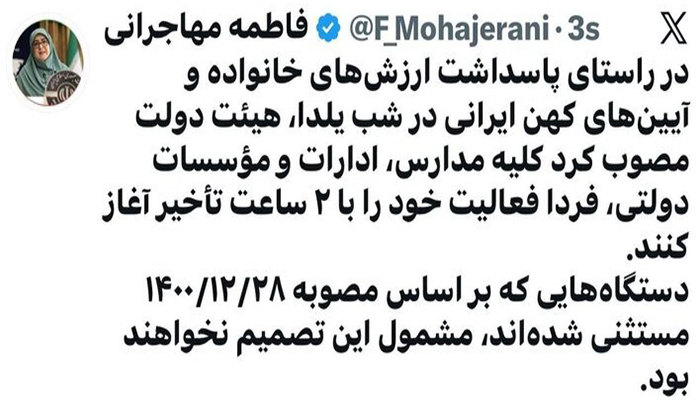 فاطمه مهاجرانی در پیام خود تصریح کرد: «در راستای پاسداشت ارزش های خانواده و آیین های کهن ایرانی در شب یلدا، هیات دولت مصوب کرد کلیه مدارس، ادارات و موسسات دولتی، فردا فعالیت خود را با تاخیر ۲ ساعته آغاز کنند.»