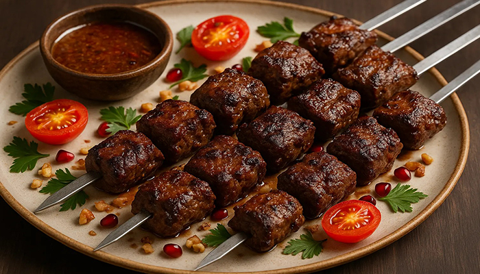 چون سطح گوشت با گردو و رب انار پوشیده شده، این مواد خیلی سریع میسوزند. بنابراین سیخها را باید زود به زود بچرخانید تا مغز گوشت بپزد اما روی آن نسوزد.