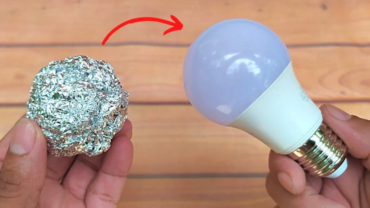 سپس، یک تکه چسب نواری کوچک (ترجیحاً چسب برق) روی فویل بچسبانید تا آن را محکم در جای خود نگه دارد و از جابجا شدن آن جلوگیری کند. این فویل، کار همان پل لحیمی را انجام میدهد. سپس لامپ را تست کرده و ببندید.